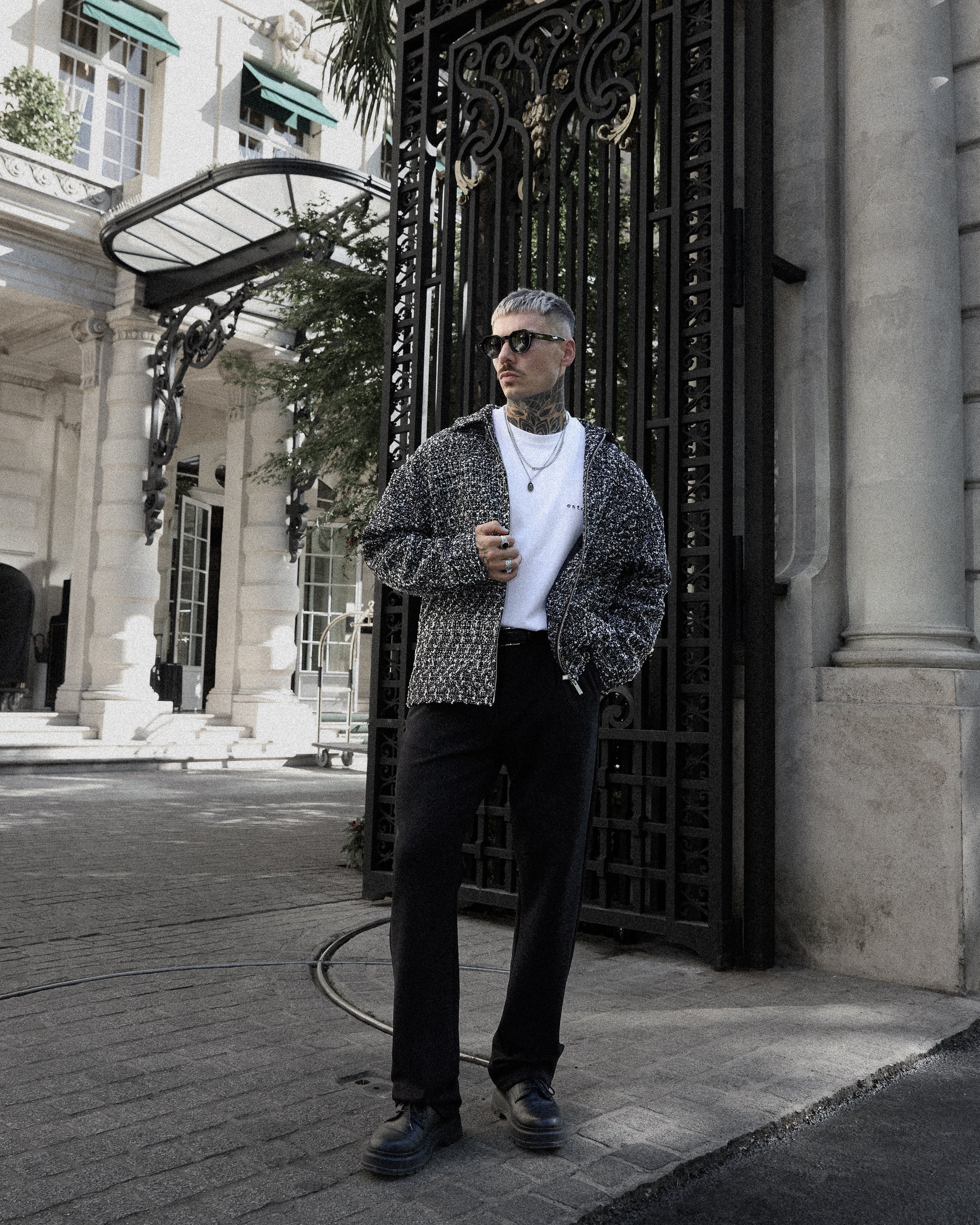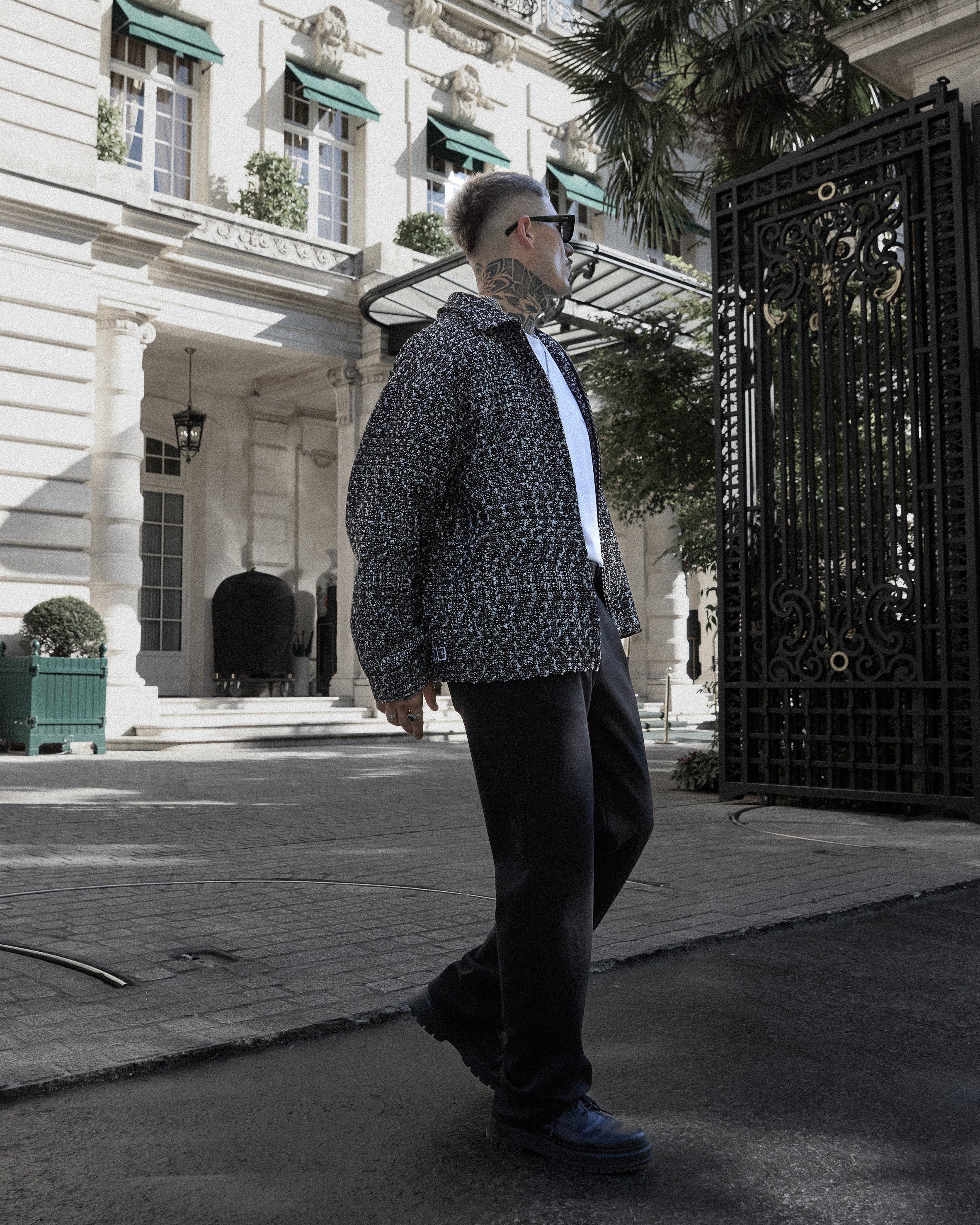 A bold silhouette defined by attention to detail: oversized fit, exposed seam lines, and refined tonal embroidery at the collar.