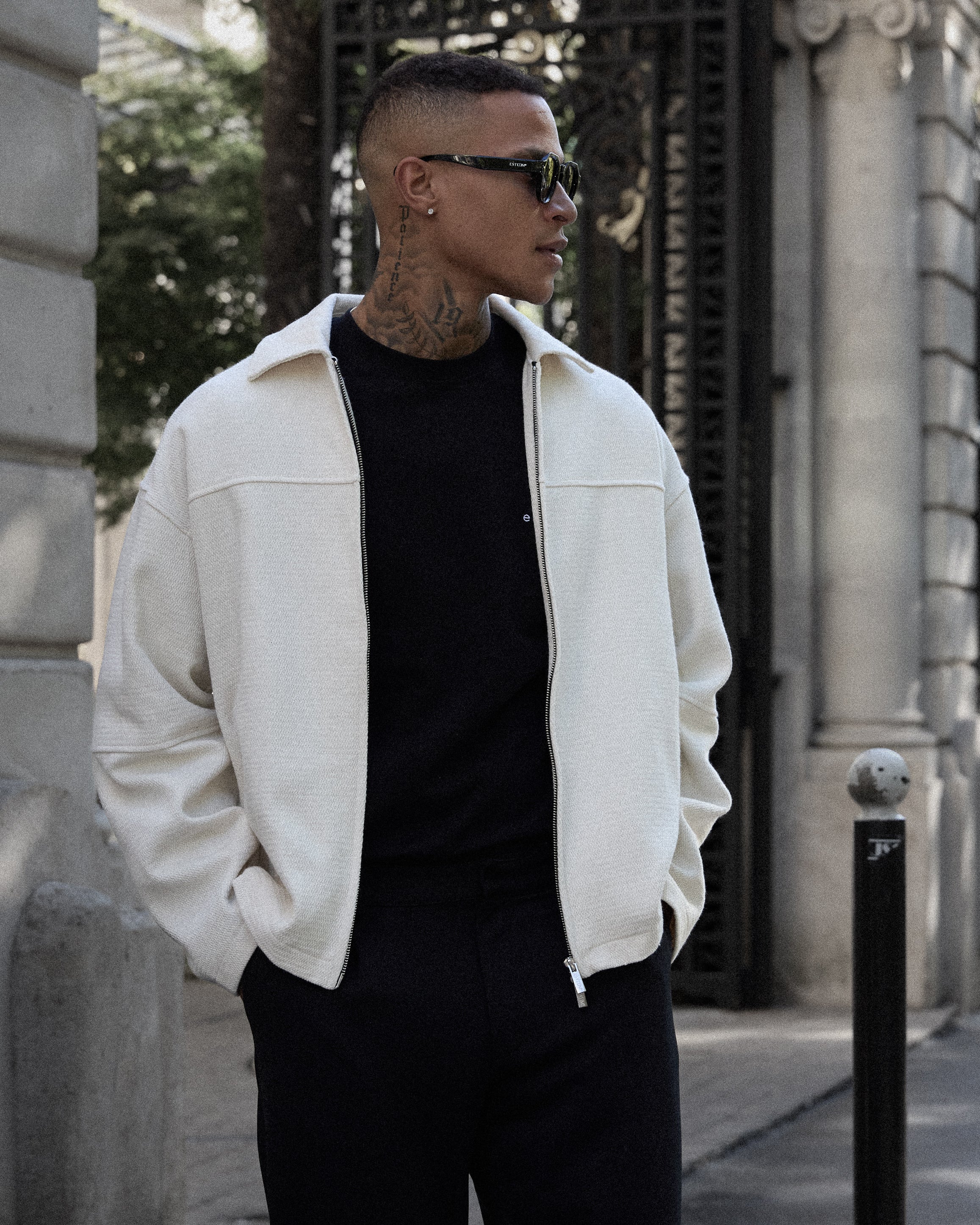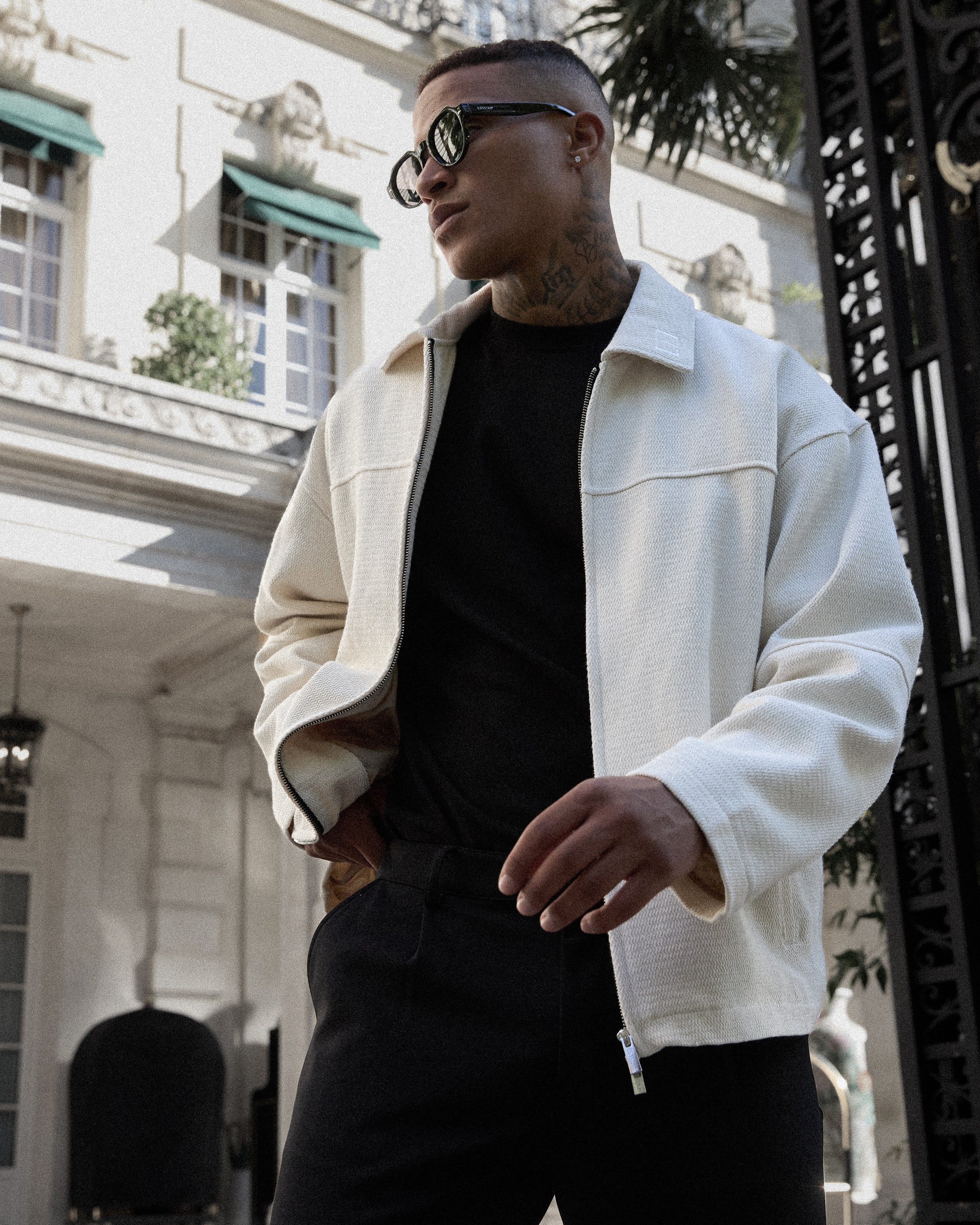 A bold silhouette defined by attention to detail: oversized fit, exposed seam lines, and refined tonal embroidery at the collar.