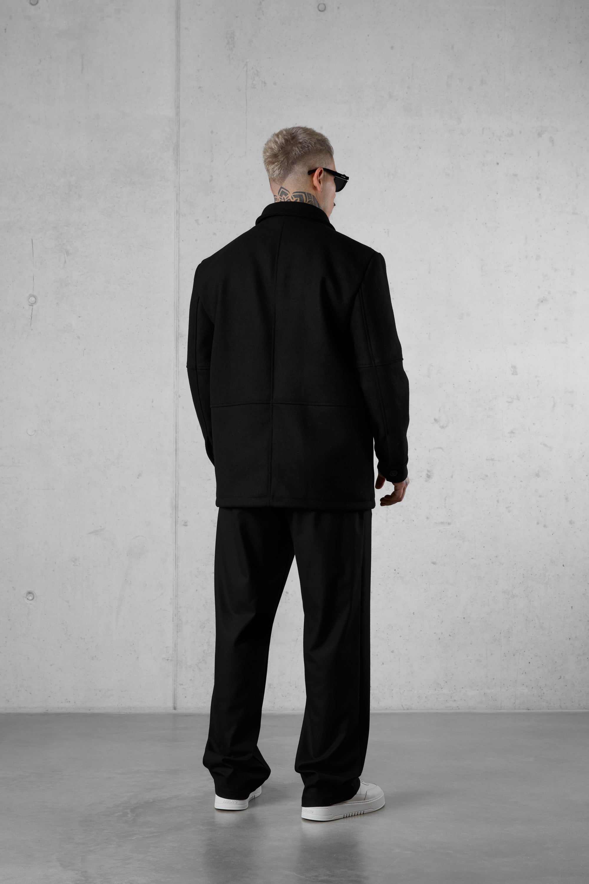 Schwarzer Kurzmantel aus schwerem Wollmix. Ein dezentes Lederpatch ergänzt das klare Design und setzt einen markanten Akzent.